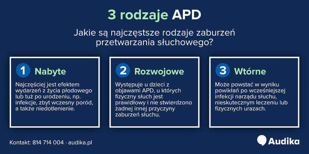 • zaburzenia przetwarzania słuchowego (APD) rozwojowe – występuje u dzieci z objawami APD, u których fizyczny słuch jest prawidłowy i nie stwierdzono innej przyczyny zaburzeń słuchu, a jego skutki mogą utrzymywać się w dorosłości;